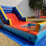 Brinquedo inflável 2 em 1: escorregador + piscina que pode ser usada com bolinhas no inverno ou com água no verão.